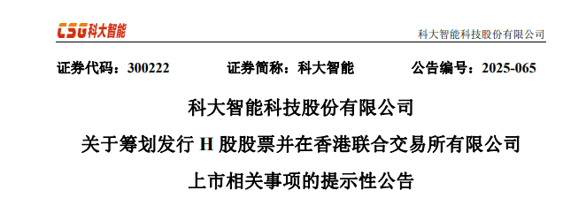 来自上海松江区的A股上市公司科大智能(300222.SZ)发布公告称,基于现经常期储备和国际市集需求,为逍遥国际化政策发展及国际业务布局需要,提高国际品牌盛名度,增强公司轮廓竞争力,稳当环球经济一体化发展趋势,公司拟筹谋境外刊行股份(H股)并肯求在香港纠合走动系数限公司主板挂牌上市。截止现在,公司正在臆想与关联中介机构就本次刊行H股并上市的关联责任进行商议,对于本次刊行H股并上市的细节尚未细目。